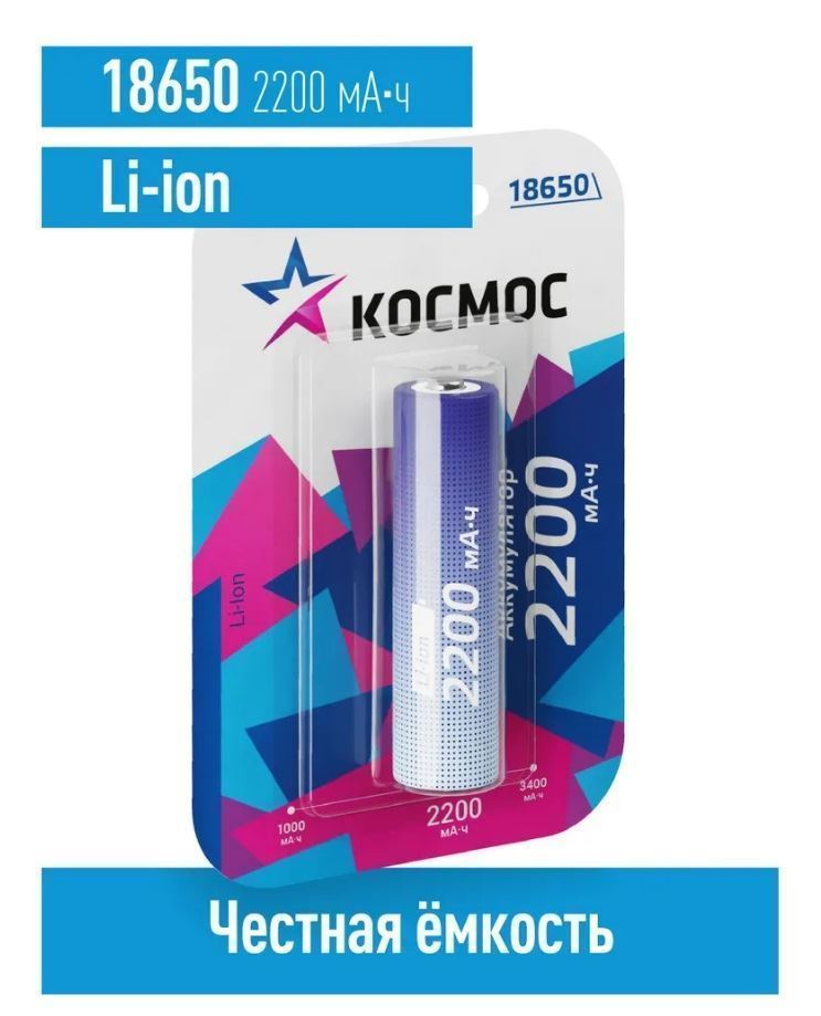 "Литий-ионный аккумулятор КОСМОС 18650 без защитной платы. Емкость батареи - 2200 мАч. Используется в устройствах снабженных собственным контроллером заряда/разряда. Как правило это аккумуляторы для ноутбуков и съемные аккумуляторы для электроинструмента, фонарей,работающие на Li-ion аккумуляторных сборках. При невысокой цене продукт имеет на 100% честную ёмкость, подтвержденную замерами. При использовании в устройстве без контроллера аккумулятор может выйти из строя.