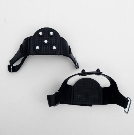Антигололед сделан из пластика с добавлением резины, надевается на пятку и вокруг ноги фиксируется липучкой.