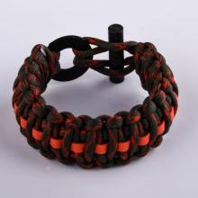 Браслет сплетён из верёвки цвета красный камуфляж, по центру оранжевая линия, схема плетения - королевская кобра, черный скребок.
