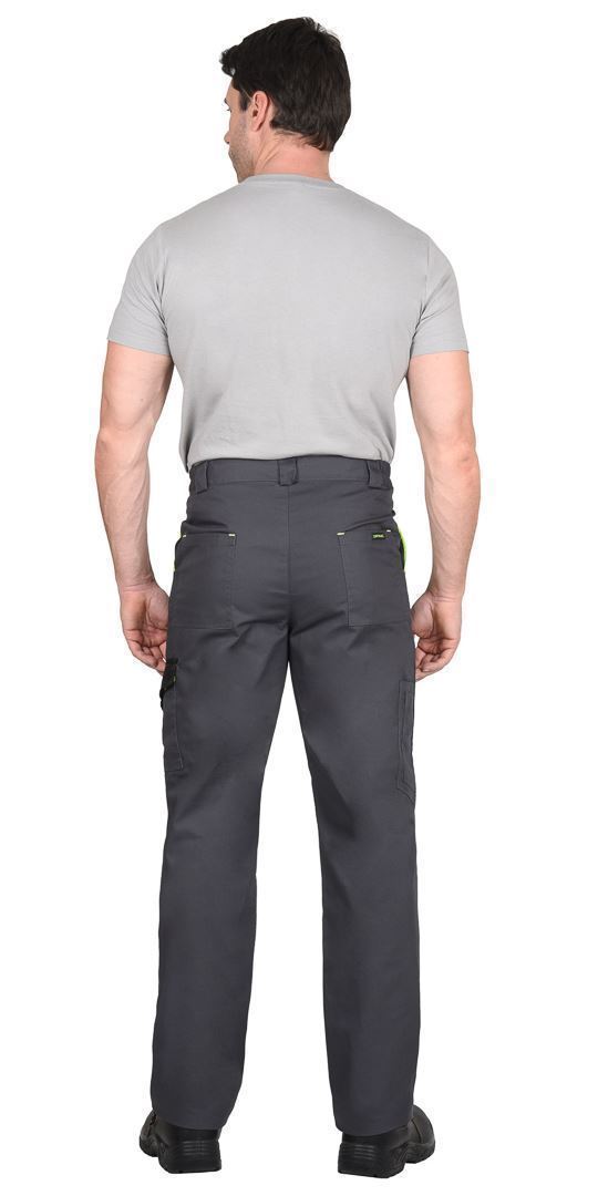 Брюки прямые, с заст.жкой спереди на тесьму «молния», с притачным поясом, с частичной стяжкой по бокам и заст.гивающимся на 1 петлю и 1пуговицу, с 5 шлевками, с внутренними боковыми карманами и наколенниками, с накладным карманом на левом боковом шве с клапаном с патой на кнопке, с двумя задними накладными карманами и карманами для инструментов.