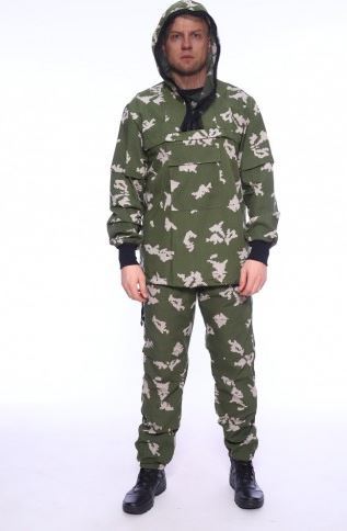 Состоит из куртки и брюк. Куртка с капюшоном и противомоскитной сеткой, убираемой в потайной нагрудный карман. Костюм дополнительно оснащен противоклещевыми ловушками.