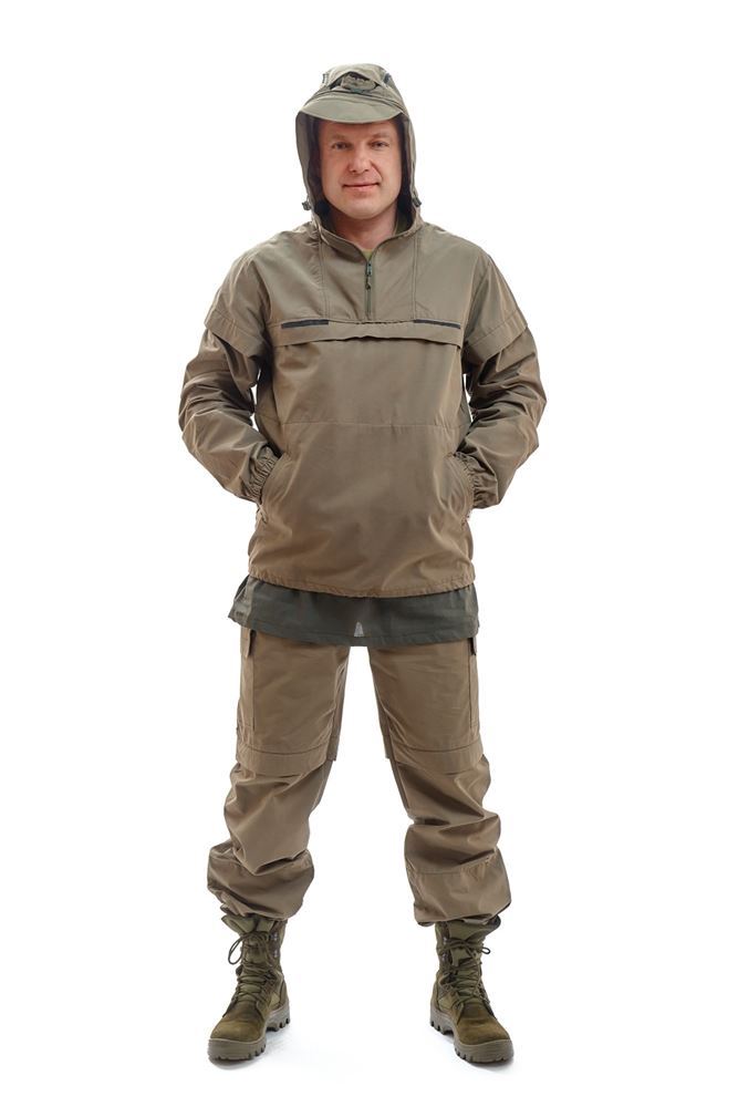 Противоэнцефалитный костюм состоит из куртки типа «анорак» с капюшоном и брюк прямого кроя.