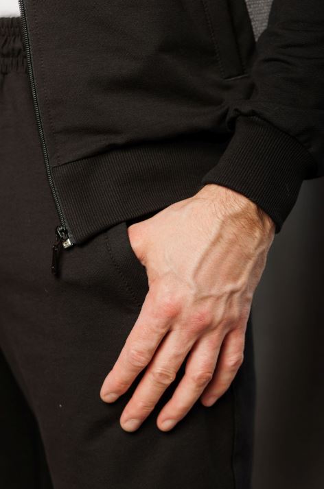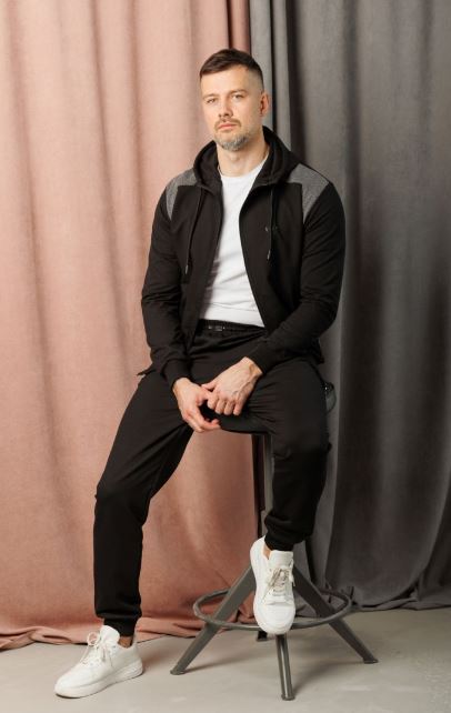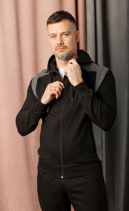 Верх - толстовка на молнии с капюшоном отличается интересным сочетанием фактур: основная часть изделия выполнена из гладкого полотна, а боковые вставки и участки на плечах — из ткани с более выраженной рельефной структурой. Это визуально подчёркивает линии корпуса и придаёт костюму выразительность. Боковые карманы на молнии. Рукава и низ изделия оформлены манжетами, обеспечивающими комфортную посадку.