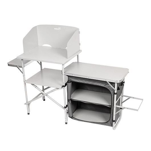 Кухня походная складная COMFORT торговой марки Helios - это идеальное решение для удобного и комфортного приготовления пищи на природе в условиях кемпинга. Такая кухня создаст непревзойдённый комфорт не только в длительных путешествиях или в базовом лагере, но может пригодиться и на даче. Максимально простая установка. Кухня имеет три стола: - основной для установки плиты (съемный ветрозащитный экран в комплекте), - два боковых - используются как рабочая поверхность или для временного хранения. Основные преимущества: • универсальная модель, • складная и легко собираемая конструкция, • тканевый шкаф для хранения кухонной утвари и продуктов, • термостойкая столешница, которая подходит для использования газовой плиты, • стальной ветрозащитный экран для работы газовой плиты, • 2 полки в шкафу из твердого ХДФ, • подставка под пакет для мусора, • транспортировочный чехол в комплекте. Характеристики: Материал каркаса: алюминиевая труба (диаметр 22 и 19 мм), порошковое покрытие, сталь 2 мм. Материал столешницы: сталь 0,7 мм, порошковое покрытие Материал столешницы (боковой) и полки (внутренняя): HDF 3 мм (влагозащитная). Ткань: Оксфорд 600D. Габаритные размеры в рабочем состоянии: 174 х 50 х 113 см. Допустимая нагрузка на столешницы - 30 кг. Вес: 12,75 кг. Комплектация: Основа кухни: 1 шт., столешница верхняя 1 шт., столешница нижняя 1 шт., защитная стенка 1 шт., боковина защитной стенки 2 шт.; шкафчик подвесной 1 шт., полка внутренняя 2 шт., инструкция по эксплуатации 1 шт., транспортировочный чехол 1 шт.