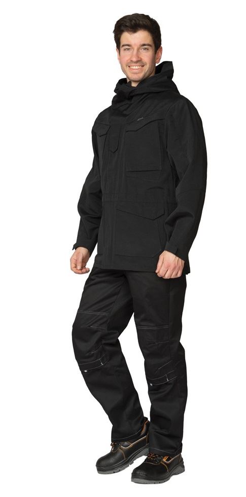 Куртка: удлинённая, прямого силуэта, эргономичного кроя, с капюшоном, с центральной застёжкой на молнию на подкладке из трикотажной сетки. Ветрозащитная планка на центральной застёжке обеспечит максимальную защиту от ветра и дождя. На ветрозащитной планке расположен клапан на контактной ленте, который предназначен для фиксации плечевого ремня сумки или нагрудной стяжки рюкзака. Рукава втачные анатомического кроя. Для регулирования объёма рукава по низу притачана фигурная пата, застёгивающаяся на контактную ленту. Нижняя часть куртки в боковых швах застёгивается на молнию для удобства при движении. Молния закрывается фигурной планкой, которая внизу застёгивается на контактную ленту. Объём куртки регулируется при помощи эластичного шнура с фиксаторами и наконечниками.
