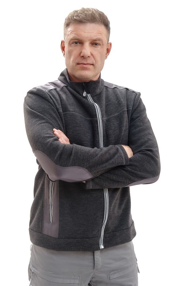Усилительные накладки в области карманов, локтей и плечевых швов защищают трикотаж от истирания.