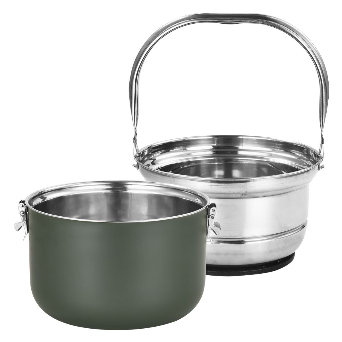 Котелок и кастрюля общим объемом в 6.8 л подходят для приготовления на различных горелках или открытом костре. Долгое время сохраняют температуру пищи.