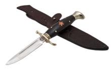 Нож "НКВД"- это сочетание надежности, элегантности и универсальности. С ножом такого типа можно отправится в тундру, тайгу или на пикник в ближайшем подмосковье. Геометрия клинка этого ножа поистине уникальна. В ней учтен многовековой опыт северных промысловых охотников. С помощью такого ножа можно добрать зверя, освежевать трофей и тут же сделать парочку лакомных вырезок для зажарки на огне. В качестве материала дизайнеры выбрали российский инструментальный сплав, который используется в тяжелой металлургии для создания режущего инструмента. Он имеет оптимальный состав, который обеспечивает отличное сочетание твердости и упругости. В этой модели высокое значение придается безопасной работе. Бочкообразная рукоять уверенно ложится в руку, а двух сторонняя гарда защищает пальцы от соскальзывания на клинок.