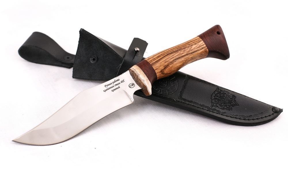 Нож комплектуется ножнами из натуральной кожи и сертификатом.