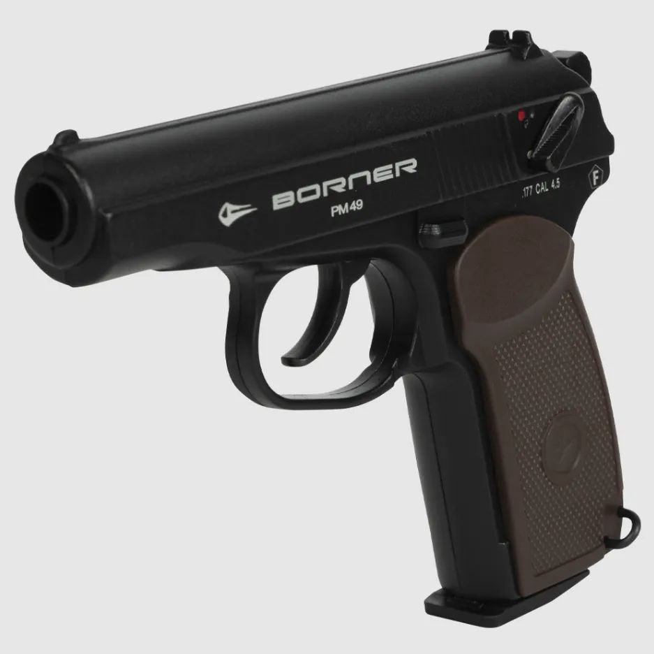 Пневматика Borner ПМ - копия всемирно известного пистолета «Макарова», сконструированного в 1949 г. Боевой аналог был на вооружении милицейских и армейских подразделений Советского Союза. Выполненная на русском инструкция облегчает эксплуатацию и знакомство с оружием. Корпус пистолета - цельный литой, позволяет взводить спусковой курок при неподвижности рамы.