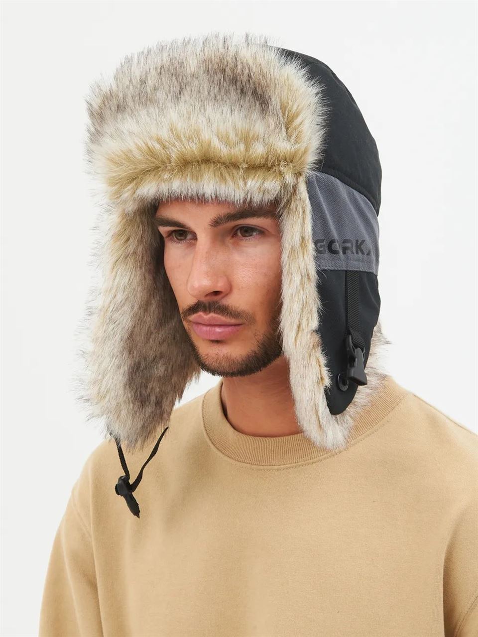 Верх зимней шапки выполнен из мембранной ткани Исландия, которая придает материалу ветрозащитные и водоупорные свойства, выводя излишки влаги. Уши шапки под подбородком фиксируются с помощью ремешка.