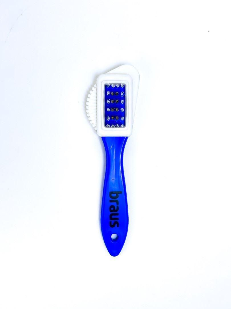 Braus щетка комбинированная для замши, нубука и велюра с синтетической щетиной бережно поднимает ворс, выравнивает лоснящиеся участки и очищает от пыли, пятен и разводов поверхность обуви.