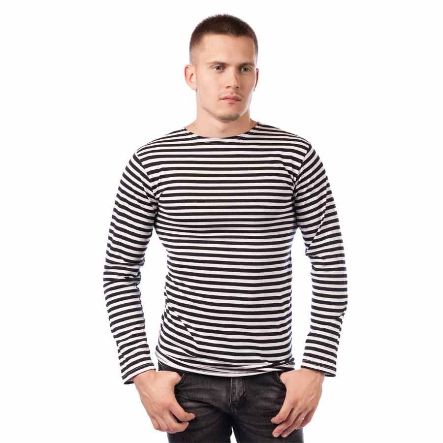 Тельняшка изготовлена из хлопкового трикотажного полотна собственного производства. Полоски связаны из цветной нити (полоска есть и с изнанки тоже)
