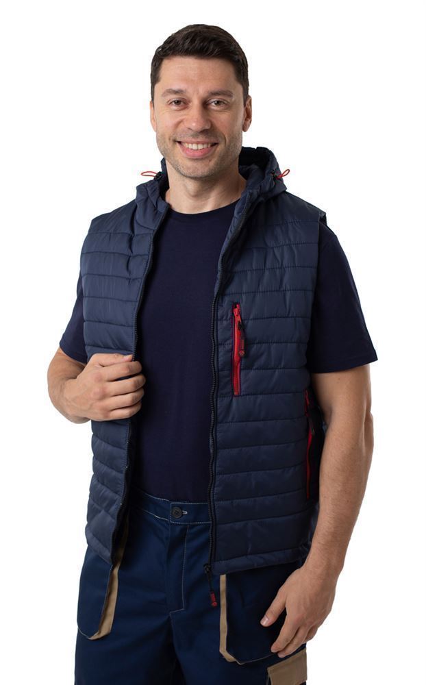 Жилет прямого силуэта на подкладке, выстеган с утеплителем, с центральной застежкой на тесьму-«молнию», прорезным карманом с молнией, капюшоном , регулировкой по низу изделия и капюшону. Наличие внутреннего кармана.